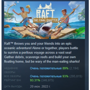 Raft is a survival game in the middle of the ocean where the player builds a raft, collects resources and defends against sharks. Each item found is important for creating tools, traps and improving the base. Explore the islands, discover new technologies and maintain life in harsh conditions. Realistic physics, cooperative mode and constant character development make the process exciting and dynamic. Suitable for those who love strategy, adventure and endurance tests.