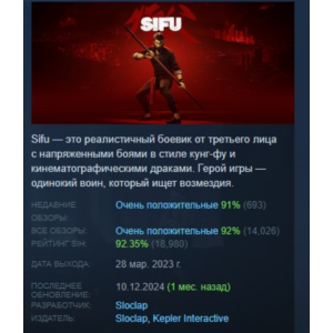 Sifu is a fast-paced action game with an emphasis on hand-to-hand combat and stylish duels. The story follows a young kung fu master who follows a path of revenge while facing dangerous opponents and clans. The unique mechanics of the hero's aging make every battle significant: mistakes cost years of life, but give new skills. The game combines intense combat, a deep combo system and an atmospheric visual style. Martial arts fans will appreciate the addictive gameplay and well-thought-out levels.