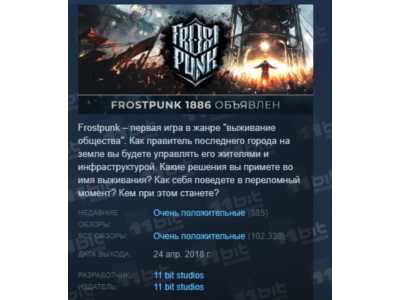 Game Description: Frostpunk is a city-building simulator with elements of strategy and the survival of a society where there is no life without heat, and every decision has its price. In a completely frozen world, people are developing steam engines to withstand the unbearable cold. You have to build the last city on earth and provide your people with the means of survival. Often, optimization and rational use of resources are on one side of the scale, and empathy and humanity are on the other. While the management of the city and society will take up the lion´s share of the ruler´s time, at some point the study of the outside world will become necessary to understand its history and current state. What decisions will you make to keep society alive? What will you do when you reach the limit? And who will you become in doing so?