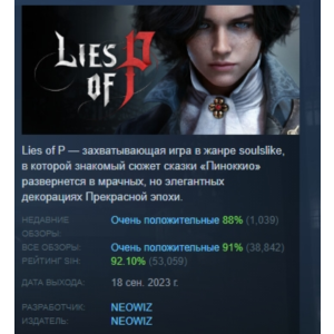 Lies of P is a Soulslike RPG featuring a dark fairy tale in the style of Bloodborne. Control Pinocchio as he battles terrifying puppets and uncovers the dark secrets of the city of Krat. A flexible weapon system, spectacular battles and many secrets will make each playthrough unique. Upgrade your character, explore levels and find paths to the truth. Lies of P is ideal for fans of dynamic battles and atmospheric adventures. Test your strength and plunge into the legend of Pinocchio in a new, exciting interpretation.