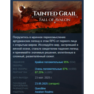 Tainted Grail: The Fall of Avalon is a role-playing game with a dark atmosphere and a deep plot. Venture into a dark world full of dangers and secrets, explore ancient ruins, fight enemies and make important decisions that affect the fate of your hero. The game combines dynamic battles, exploration of a mysterious island and many quests that require thoughtful tactics and courage. Impressive graphics and high-quality detailing make the game attractive to fans of dark fantasy. An ideal choice for young gamers who value the atmosphere and the opportunity to influence the outcome of events.