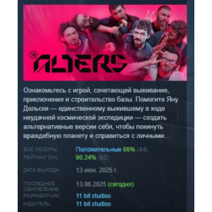 The Alters is an atmospheric sci-fi survival game with an original concept: you create alternative versions of yourself to survive on a hostile planet. Each alter has a unique skill set, history and character. Develop your base, make difficult decisions and try to get out alive. An excellent choice for those who appreciate non-standard gameplay and a deep plot. The game is captivating with its visuals and ideas. The digital key is available immediately after purchase - start surviving without expectations.
