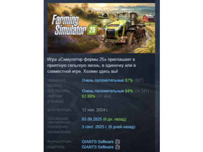 --- 🎮 **Общая информация** • Тип товара: Цифровой ключ • Платформа активации: Steam • Регион активации: Россия+СНГ+Украина • Язык игры: Русский (субтитры + интерфейс) / Английский --- 📝 **Описание** Погрузитесь в мир сельского хозяйства с Farming Simulator 25 — самой реалистичной и увлекательной симуляцией фермерства на рынке! В этой игре Вы сможете управлять своей собственной фермой, используя широкий спектр современных сельскохозяйственных машин и инструментов. Ключевые особенности: Огромный открытый мир: Исследуйте обширные поля, леса и деревни, создавая свою уникальную ферму в живописных ландшафтах. Разнообразие техники: Используйте более 400 лицензированных машин и инструментов от известных производителей, включая тракторы, комбайны и прицепы. Многопользовательский режим: Играйте с друзьями или присоединяйтесь к онлайн-сообществу, чтобы совместно развивать свои фермерские навыки и делиться ресурсами. Разнообразие культур: Выращивайте различные культуры, такие как пшеница, кукуруза, картофель и многие другие, а также ухаживайте за животными, чтобы получать дополнительные ресурсы. Экономическая стратегия: Управляйте финансами, планируйте свои действия и развивайте свою ферму, чтобы достичь успеха и стать настоящим фермером. Моддинг: Создавайте и загружайте собственные модификации, чтобы расширить возможности игры и сделать ее еще более увлекательной. Farming Simulator 25 — это не просто игра, это целый мир, где Вы можете реализовать свои мечты о фермерстве. Присоединяйтесь к миллионам игроков по всему миру и начните свое фермерское приключение уже сегодня! ✨ **Преимущества** ✅ Официальный лицензионный ключ ✅ Мгновенная автоматическая доставка ✅ Игра навсегда остается на вашем аккаунте --- 🛠 **Как активировать ключ в Steam**