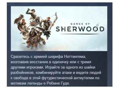 ✅ Активация: Steam ✅ Регион активации : Россия и страны СНГ ✅ Поддерживаются все языки указанные на странице с игрой в Steam (при необходимости ознакомьтесь самостоятельно). ✅ Возврат товара невозможен. Сделайте свое приключение в Gangs of Sherwood еще более захватывающим с престижным изданием Lionheart Edition. Включает: Lionheart Skin Set: С гордостью носите цвета короля Ричарда Львиного Сердца и ведите борьбу против узурпаторов Англии. В этот набор входят 4 эксклюзивных дизайна нарядов, доспехов и оружия для героев игры. Alan-a-Dale Alternative Skin: У менестреля и кукольника припасено немало нарядов. Он всегда выглядит безупречно: и в приключениях, и во время передышки в убежище. Digital Artbook: Погрузитесь в научно-фэнтезийный мир Gangs of Sherwood с буклетом эксклюзивных иллюстраций к игре и подробной информацией о переосмыслении легенды. Digital Soundtrack: Слушайте музыку из игры, когда захочется. Gangs of Sherwood — это экшен-игра для нескольких игроков (от 1 до 4), действие которой происходит в переосмысленной вселенной Робина Гуда. Благодаря могуществу философских камней войска шерифа Ноттингема сильны как никогда. Народ Англии страдает под гнетом власть имущих... ВОЗГЛАВЬТЕ ВОССТАНИЕ Выберите Робина, Мэриан, Брата Тука или Маленького Джона — любого из четырех героев с уникальными настраиваемыми стилями игры — и отправляйтесь грабить богатых, чтобы освободить народ. Везде — от Шервудского леса до летающего замка шерифа — вас ждут могущественные враги. Комбинируйте боевые стили разных героев и расстройте планы тирана, сражаясь с улучшенными солдатами, грозными боевыми машинами и устрашающими боссами, которые встретятся вам на пути. ГРАБЬТЕ БОГАТЫХ, ЧТОБЫ РАЗДАТЬ ВСЕ БЕДНЫМ... И ДОБЫТЬ СНАРЯЖЕНИЕ! Повышайте свою репутацию, спасая невинных, — так вы откроете новые улучшения и еще более разрушительные комбо. Потратьте заработанное тяжелым трудом золото у торговцев, чтобы усовершенствовать снаряжение и выбрать навыки, которые больше всего подойдут вашему стилю боя. КООПЕРАТИВНЫЙ ЭКШЕН ДЛЯ 4 ИГРОКОВ Выполняйте ультраклассные комбо, совершая все более впечатляющие атаки и действуя сообща с другими членами команды. Соберитесь вместе с друзьями в убежище, чтобы придумать наилучшую тактику, а затем отправляйтесь на задание и опробуйте ее в бою.