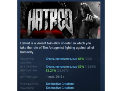 Лицензионный ключ для активации в Steam игры Hatred. Сразу после оплаты ключ отображается в окне браузера + автоматически отправляется на ваш e-mail.