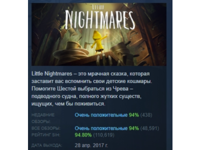 Моментально после оплаты вы получаете Steam ключ без региональных ограничений (Global Key / Region Free / ROW) на активацию игры Little Nightmares Страница игры в Steam - https://store.steampowered.com/app/424840/Little_Nightmares/