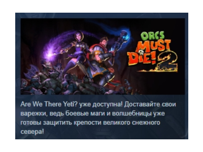 ✅ Активация: Steam ✅ Регион активации : Россия и страны СНГ ✅ Поддерживаются все языки указанные на странице с игрой в Steam (при необходимости ознакомьтесь самостоятельно). ✅ Возврат товара невозможен. Вы швыряли их в разные стороны, жгли огнем, нарезали ломтиками… Счет шел на тысячи — но теперь требуется удвоить усилия! Во второй части «Стратегической игры 2011 года» по версии AIAS от студии Robot Entertainment вам предстоит прорубаться через несметные полчища орков на пару с другом! Вновь окунитесь в самую гущу битвы, играя за могущественного боевого мага или хитроумную волшебницу. Защищайте новые крепости и гномьи шахты, истребляйте тысячи орков и прочих чудовищ — в вашем распоряжении самое разнообразное оружие, заклинания, стражники, ловушки и амулеты. Проходите новую кампанию вместе с другом в совместной игре — либо боритесь за выживание в бесконечном режиме! Открывайте доступ к новым и старым средствам обороны, совершенствуйте их и пускайте в дело — пусть перемалывают полчища орков в сочный зеленый фарш! Ключевые особенности: Совместная игра! — В вашем распоряжении два героя. Боевой маг бесстрашно бросается навстречу опасности, волшебница же предпочитает держаться от врагов подальше, сдерживая их с помощью колдовских чар и подчиняя своей воле. Сюжет кампании. — Повествование продолжится с того места, на котором история оборвалась в конце первой части. Проходить новую сюжетную кампанию можно как в одиночку, так и вдвоем в режиме совместной игры! Новый режим бесконечной игры. — Играя в одиночку или вместе с другом, проверьте себя на прочность, отражая одну за другой нескончаемые атаки грозных противников. Режим «Классика». — Пользователи Steam, купившие оригинальную Orcs Must Die!, автоматически получат доступ к 10 уровням первой части для совместной игры, где смогут сразиться с новыми врагами! Более 20 опаснейших противников. — Дайте отпор новым жутким тварям, в числе которых элементали земли, тролли и нетопыри. А вместе с ними в гости пожалуют и все ваши старые знакомые из оригинальной Orcs Must Die! Более 50 видов оружия, ловушек и стражников. — Вы сможете выбрать что угодно из огромного арсенала старых и новых средств обороны, куда входит и абсолютно новый набор магических амулетов. Обширная система усовершенствований. — Вам доступно более 255 усовершенствований для ловушек и оружия, благодаря чему можно подобрать арсенал под свой стиль игры. Реиграбельность. — Благодаря разнообразию игровых режимов, уровню сложности «Ночной кошмар» и системе рейтингов к игре хочется возвращаться снова и снова. Подсчет очков и список лидеров. — Соревнуйтесь с друзьями, стремитесь занять верхнюю строчку в списках лидеров как в одиночной, так и совместной игре!