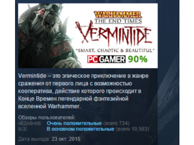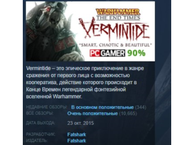 Vermintide – это эпическое приключение в жанре сражения от первого лица с возможностью кооператива, действие которого происходит в Конце Времен легендарной фэнтезийной вселенной Warhammer. Действия Vermintide происходят в городе Юбершрайк и его окрестностях, которые кишат скавенами – расой безжалостных людей-крыс. Вы будете играть роль одного из пяти героев, каждый из которых обладает уникальной личностью, игровым стилем, способностями и экипировкой. Работая сообща, вы должны использовать индивидуальные способности героев, чтобы выжить в апокалиптическом вторжении орд скавенов. Сражения будут происходить в разнообразных местностях, начиная от вершины Башни Магна и заканчивая недрами Нижней Империи. Время смертных подходит к концу, и приближается царство Хаоса. Темные боги наконец объединились с единой целью, распространяя свое безумие по всему миру, как никогда прежде. В Империи Зигмар Карл Франц пристально наблюдает за вторжением диких северян, но это далеко не единственная угроза. Ведь взошла полная луна Хаоса Моррслиб, и пронзительные голоса эхом пронеслись по туннелям глубоко под городами Империи, а орды скавенов устремились к поверхности. Сначала нечто внезапно появляется в городе Юбершрайке: отвратительная визжащая масса, сметающая всё на своем пути. И вот уже Юбершрайк стал одним большим кладбищем, тонущим под зловещей тенью Рогатой Крысы. Однако даже в самые темные времена всегда есть герои, освещающие путь. Пока опустевший город проседает и съеживается от страха, подобно живому существу, пять воинов, объединенных капризной судьбой, дают отпор бой людям-крысам. Будущее покажет, хватит ли им сил, чтобы выжить, не говоря уже о том, чтобы длительное время работать сообща и помешать захватчикам. Впрочем, одно совершенно ясно: если эти пятеро падут, Юбершрайк падет вместе с ними. НАЗВАНИЕ: Warhammer: End Times - Vermintide ЖАНР: Экшены, Инди РАЗРАБОТЧИК: Fatshark ИЗДАТЕЛЬ: Fatshark СЕРИЯ ИГР: Warhammer ДАТА ВЫХОДА: 23 окт. 2015